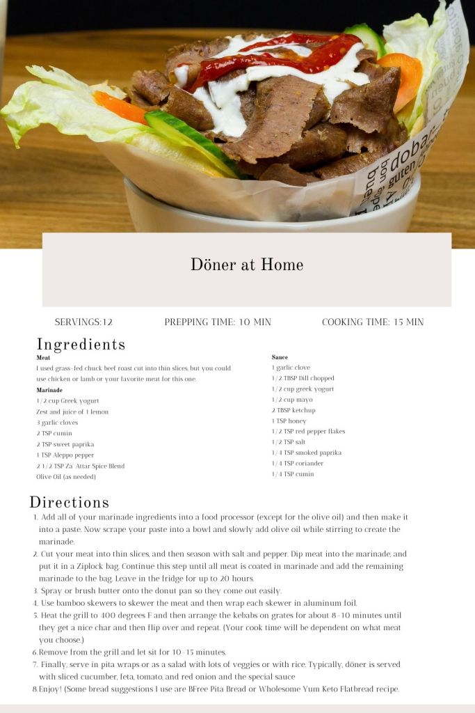 The dish evolved from the vertical roasting of seasoned meat, traditionally lamb or beef, on a rotating skewer known as a “doner” or “döner” in Turkish. It gained international popularity in the latter half of the 20th century and has since become a ubiquitous and beloved fast-food item worldwide. It’s one of my favorite dishes to get in Europe, and when I come back to the states I always crave it but have to make it in a special diet friendly way. Hopefully, you can enjoy this delicious dish at home as well!